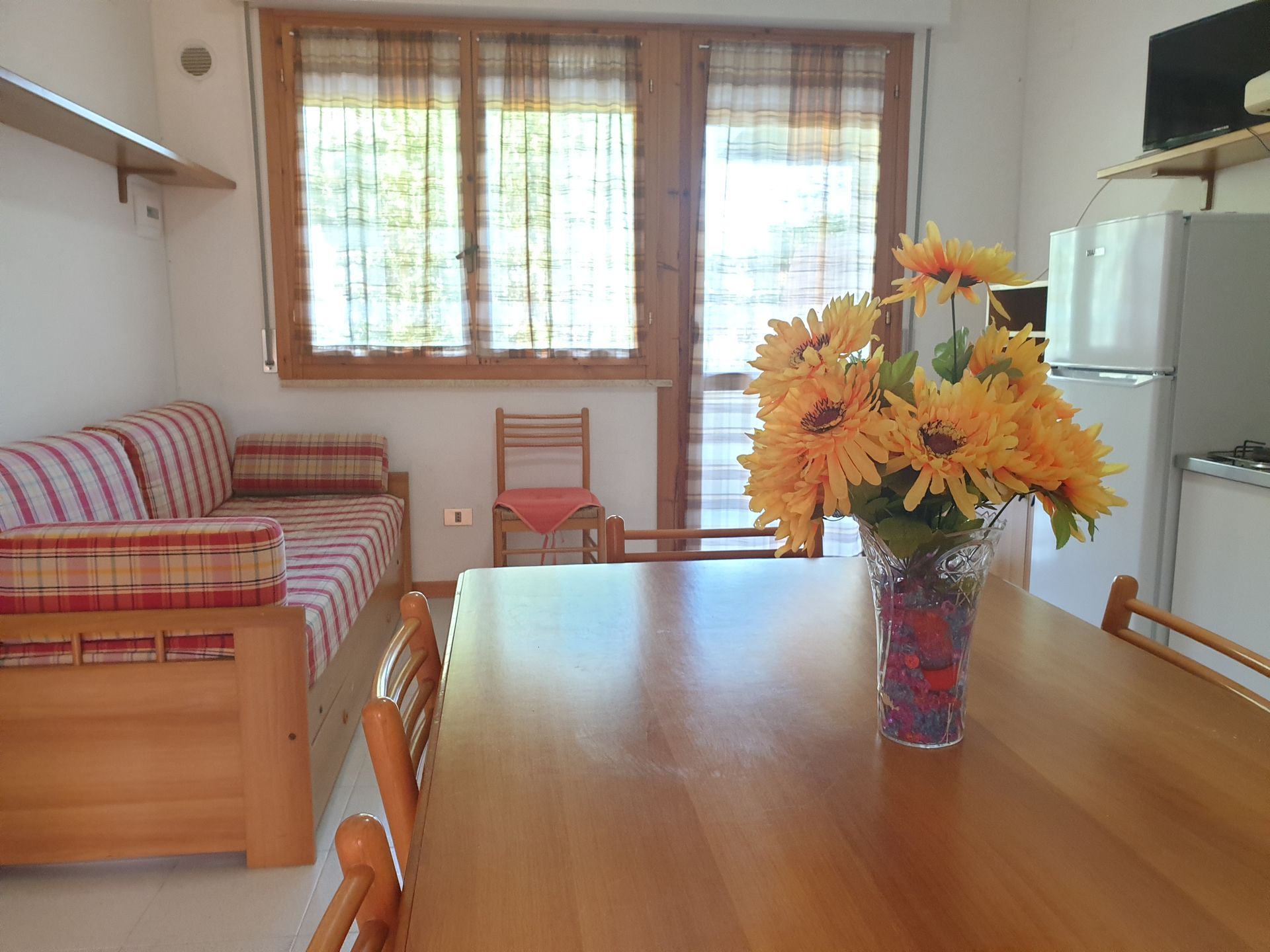 Appartamento al primo piano in zona tranquilla, ma vicino a tutti i servizi, composto da: soggiorno con angolo cottura e divano letto (due singoli), camera matrimoniale che si affaccia al secondo terrazzino, bagno con doccia. L'appartamento è dotato di TV e lavatrice. Posto auto nel vicino parcheggio condominiale. (no posti assegnati). Dista circa 450mt dal mare