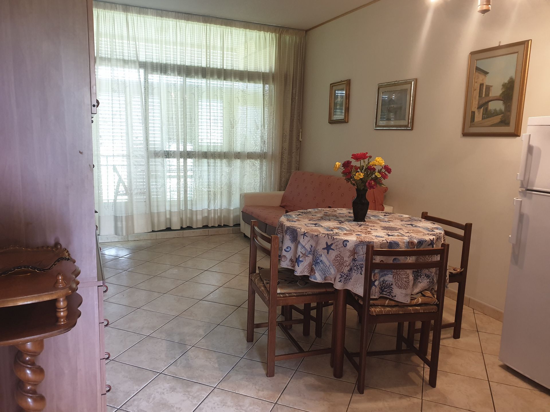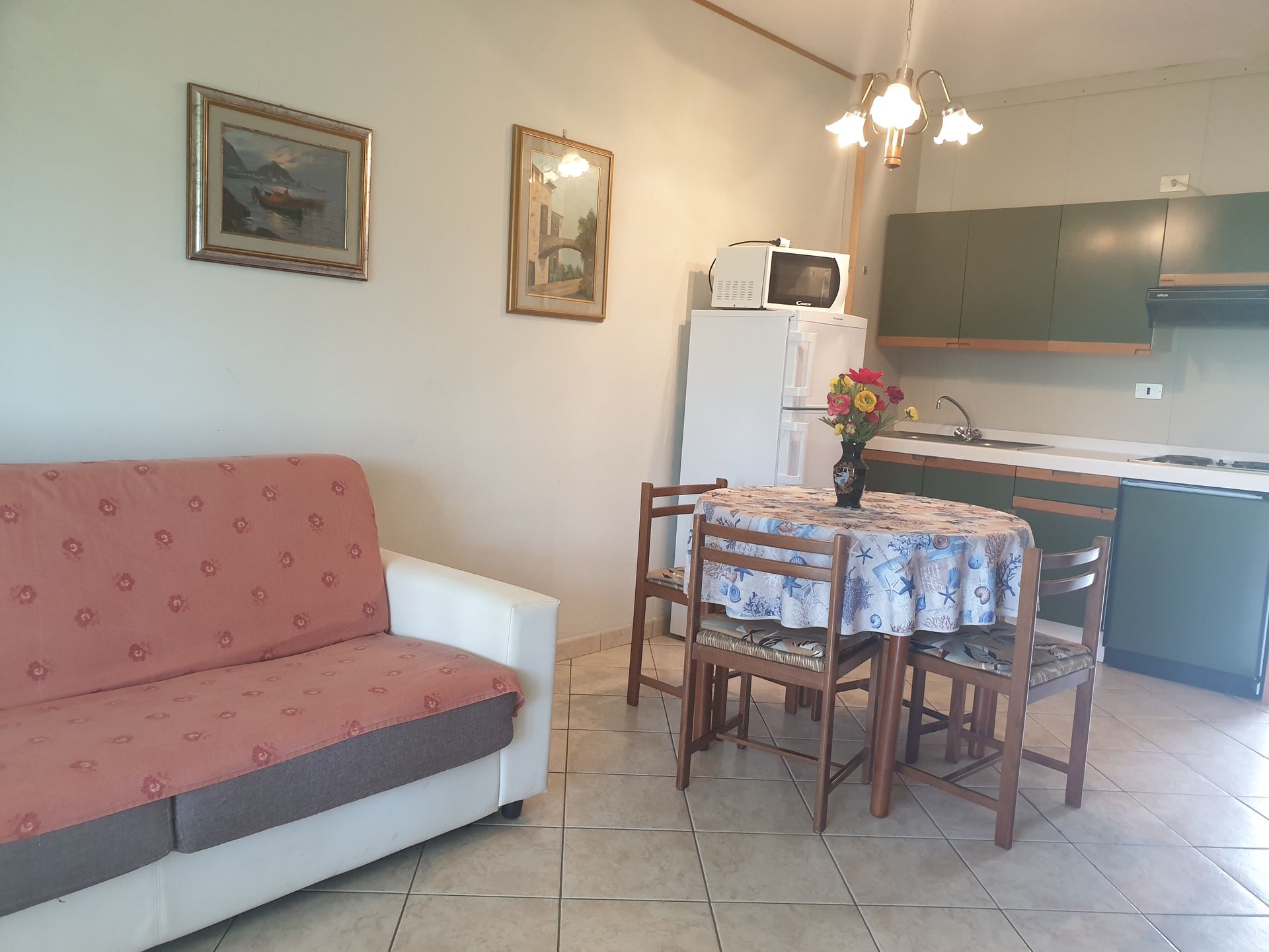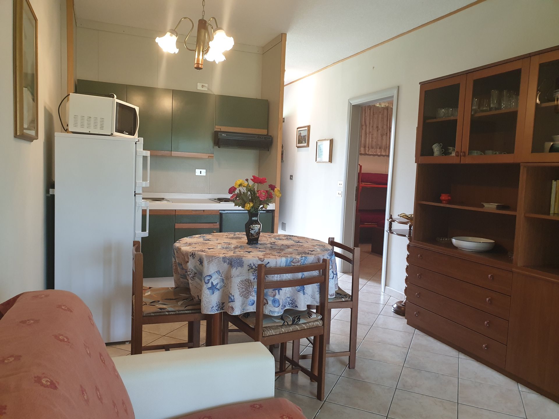 Appartamento al primo piano in Residence composto da: soggiorno con angolo cottura e divano letto matrimoniale, camera con letto matrimoniale e letto a castello, bagno con doccia, veranda pranzabile. L'appartamento dispone di utensili necessari per la cucina. Dotato di lavatrice e Tv. Accesso gratuito alla piscina e parcheggio condominiale (no posti assegnati). Dista circa 300mt dal mare