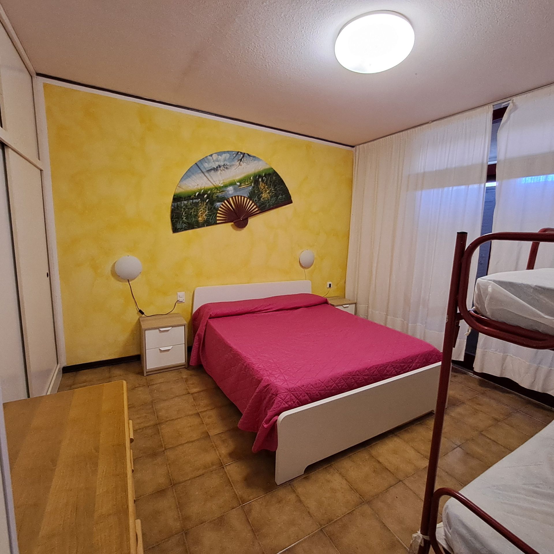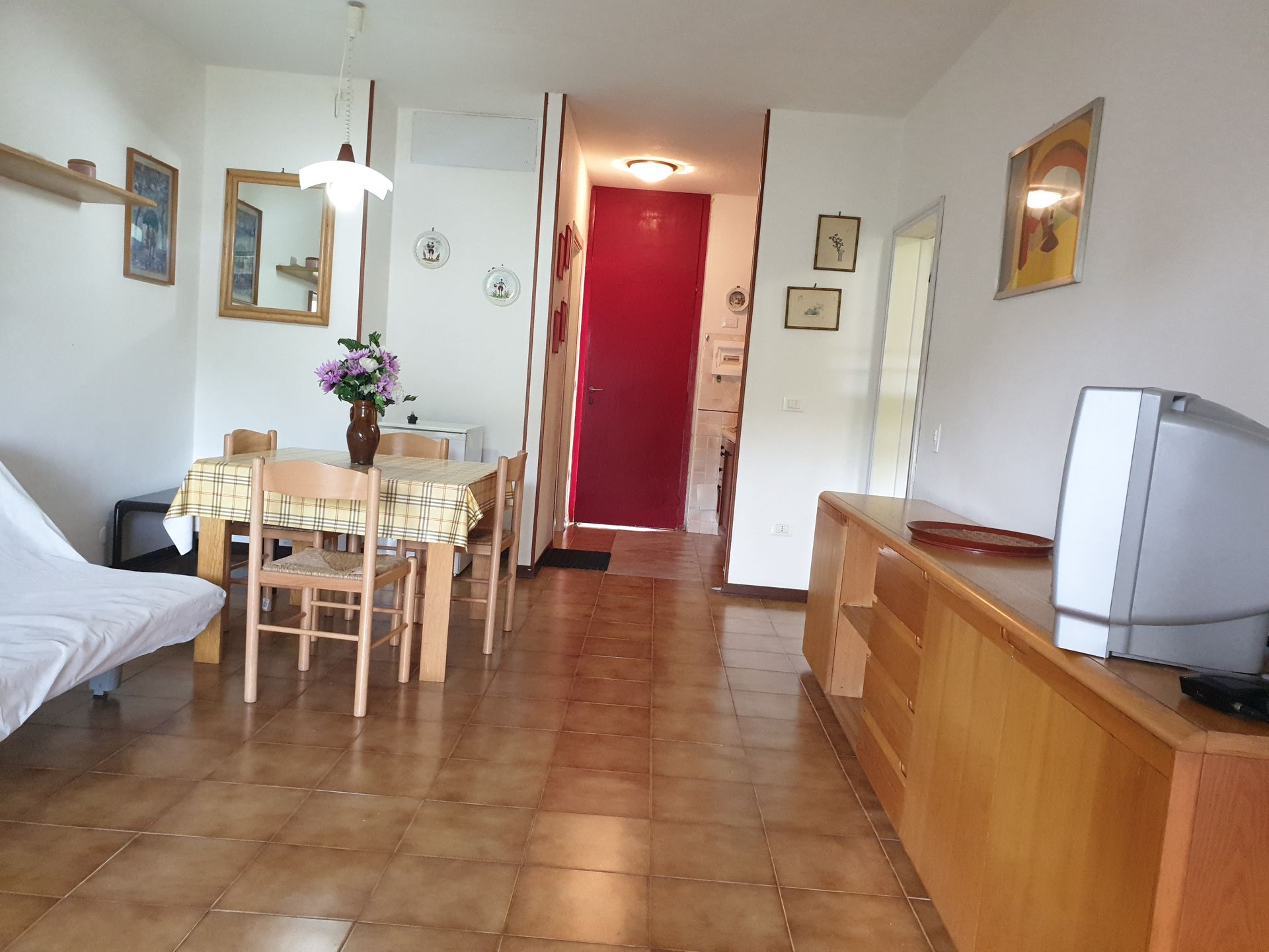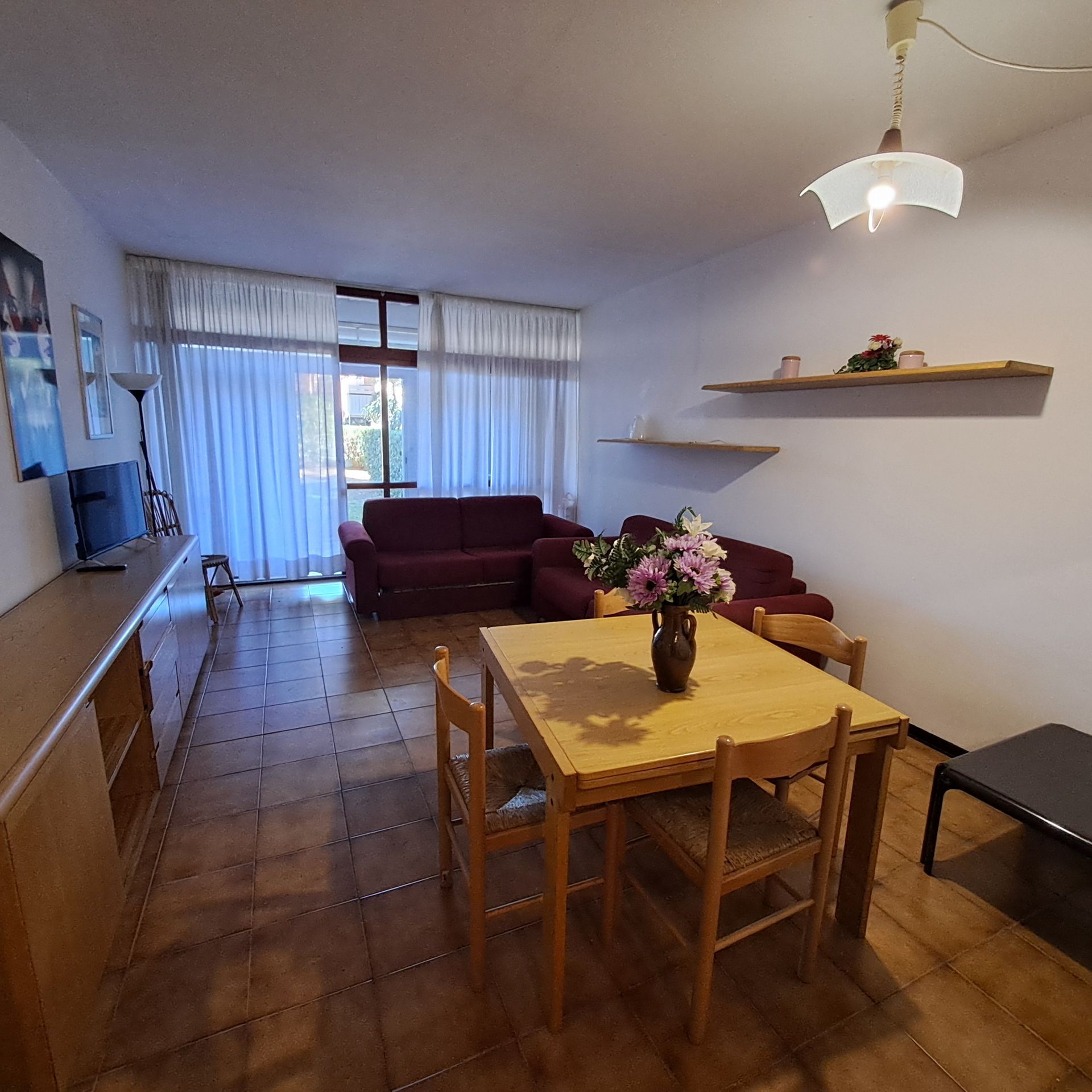 Appartamento al piano terra in Residence composto da: soggiorno con angolo cottura e divano letto matrimoniale, camera con letto matrimoniale e letto a castello, bagno con doccia, due verande e giardino. L'appartamento dispone di utensili necessari per la cucina e TV. Accesso gratuito alla piscina e parcheggio condominiale (no posti assegnati). Dista circa 450mt dal mare