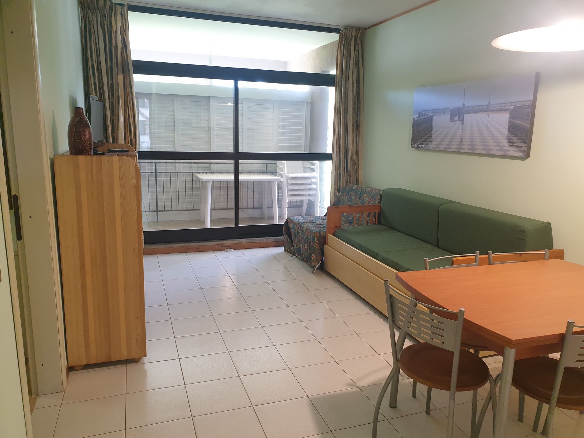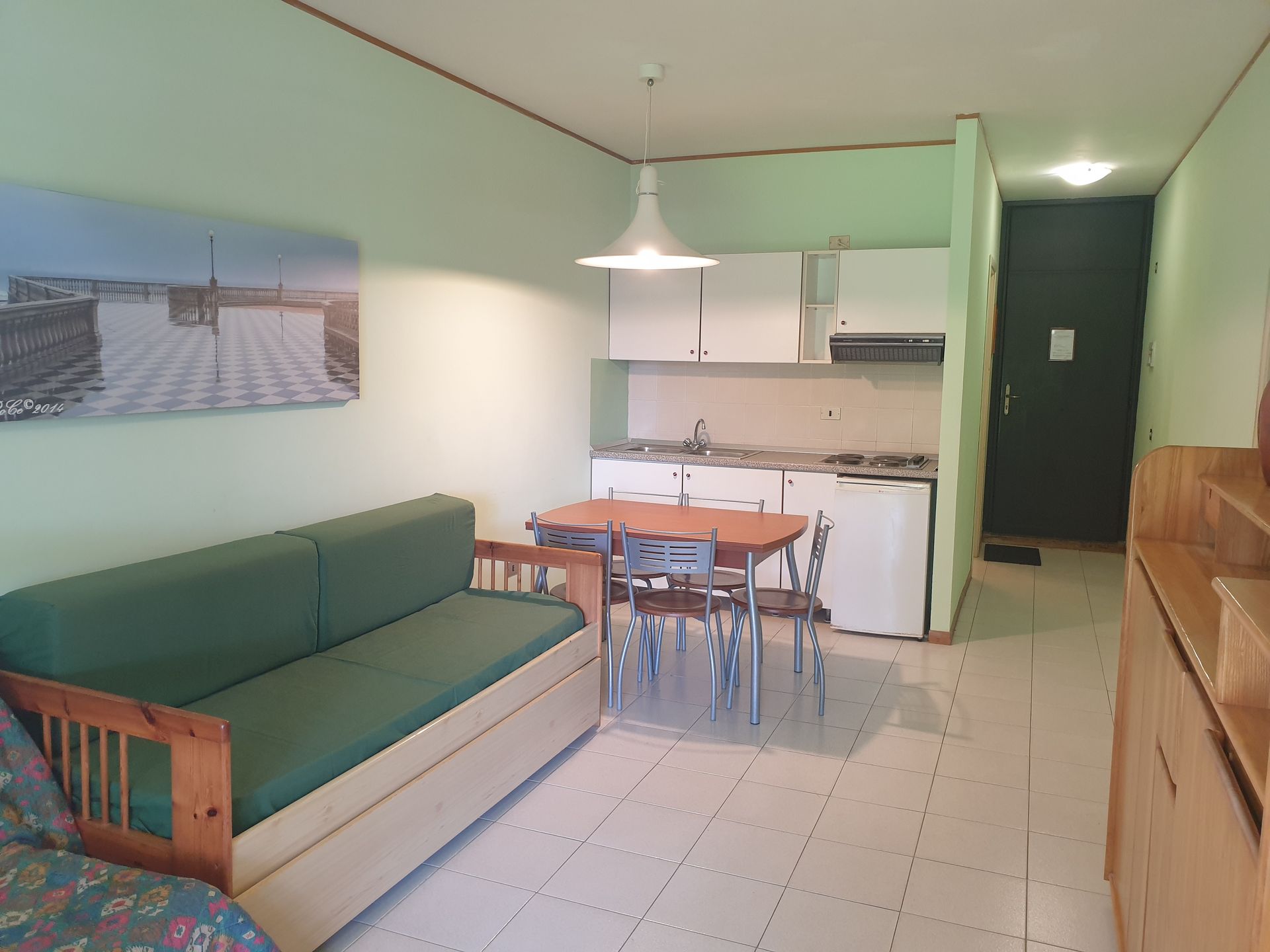Appartamento al primo piano in Residence composto da: soggiorno con angolo cottura e divano letto (due singoli), camera con letto matrimoniale, bagno con doccia, doppia veranda. L'appartamento dispone di utensili necessari per la cucina. Dotato di lavatrice e Tv. Accesso gratuito alla piscina e parcheggio condominiale (no posti assegnati). Dista circa 250mt dal mare
