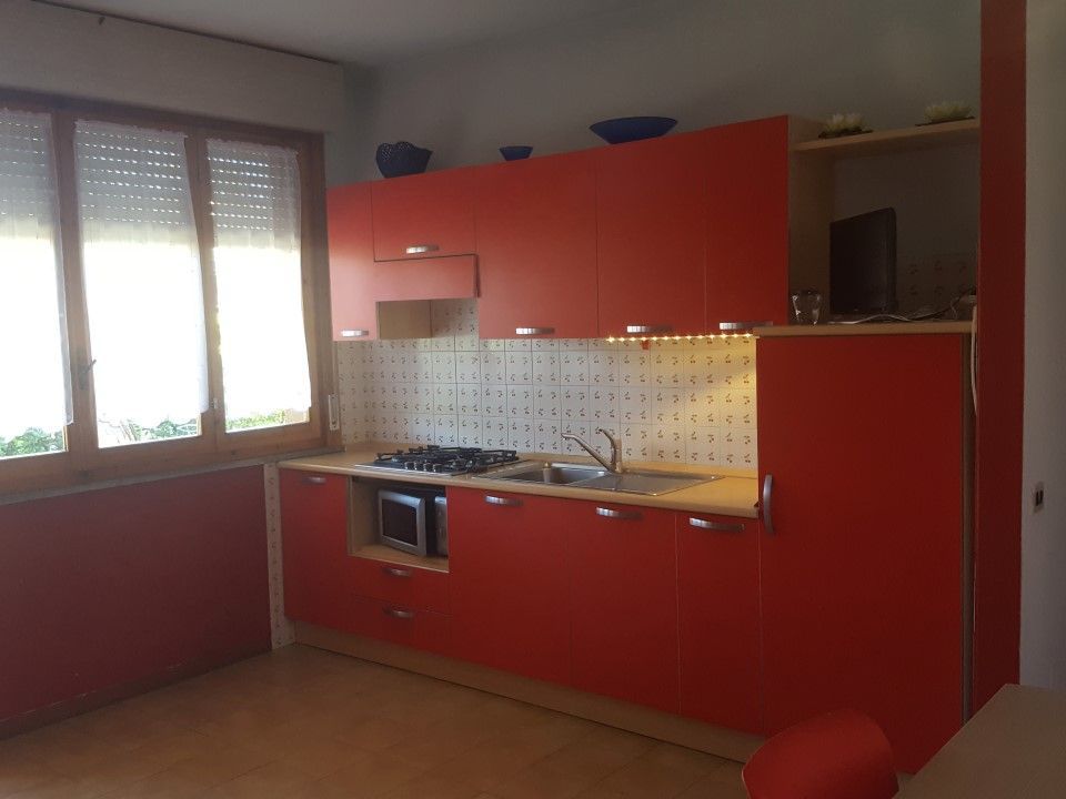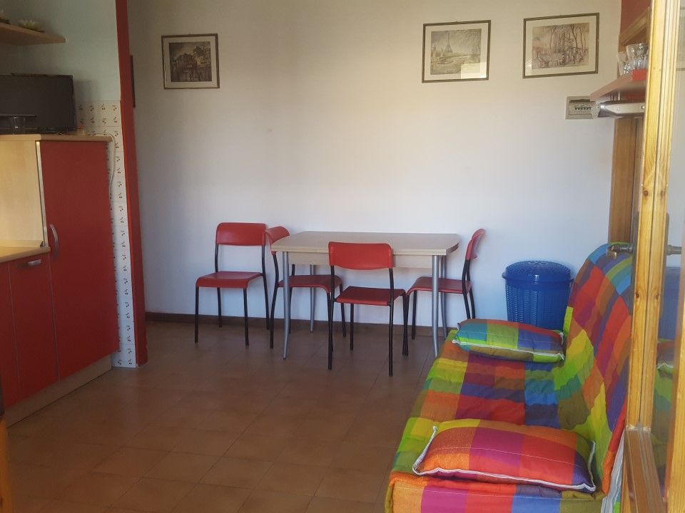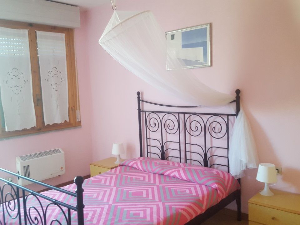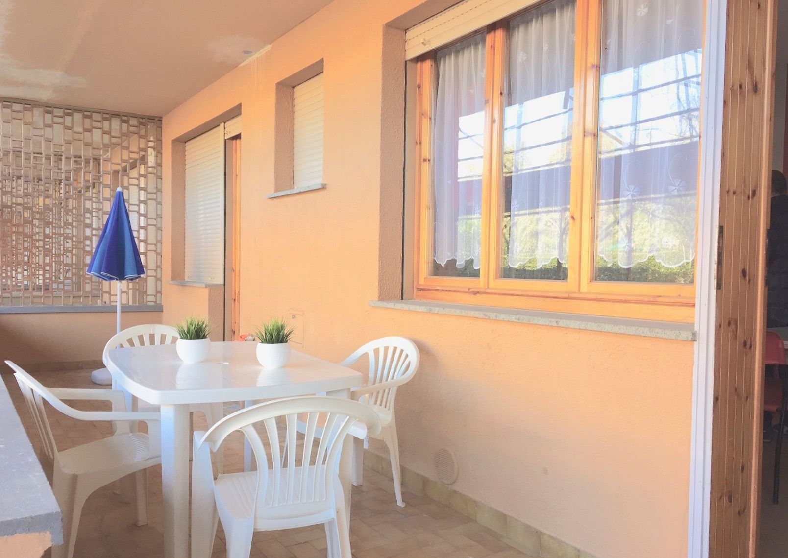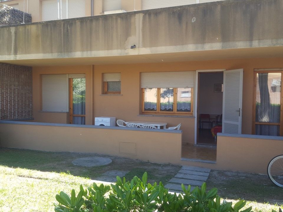Trilocale al piano terra con giardino in case a schiera. Composto da soggiorno con angolo di cottura e divano letto matrimoniale, 2 camere matrimoniali, bagno con doccia, ampio balcone pranzabile con affaccio sul giardino. L'appartamento è dotato di TV e lavatrice. Parcheggio condominale (no posti auto privati), e centro commerciale. A circa 450mt dal mare